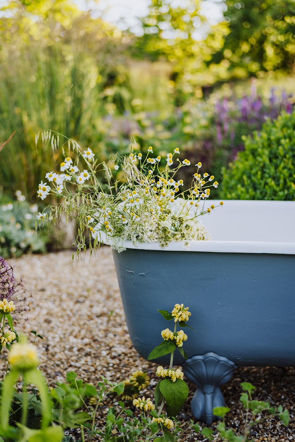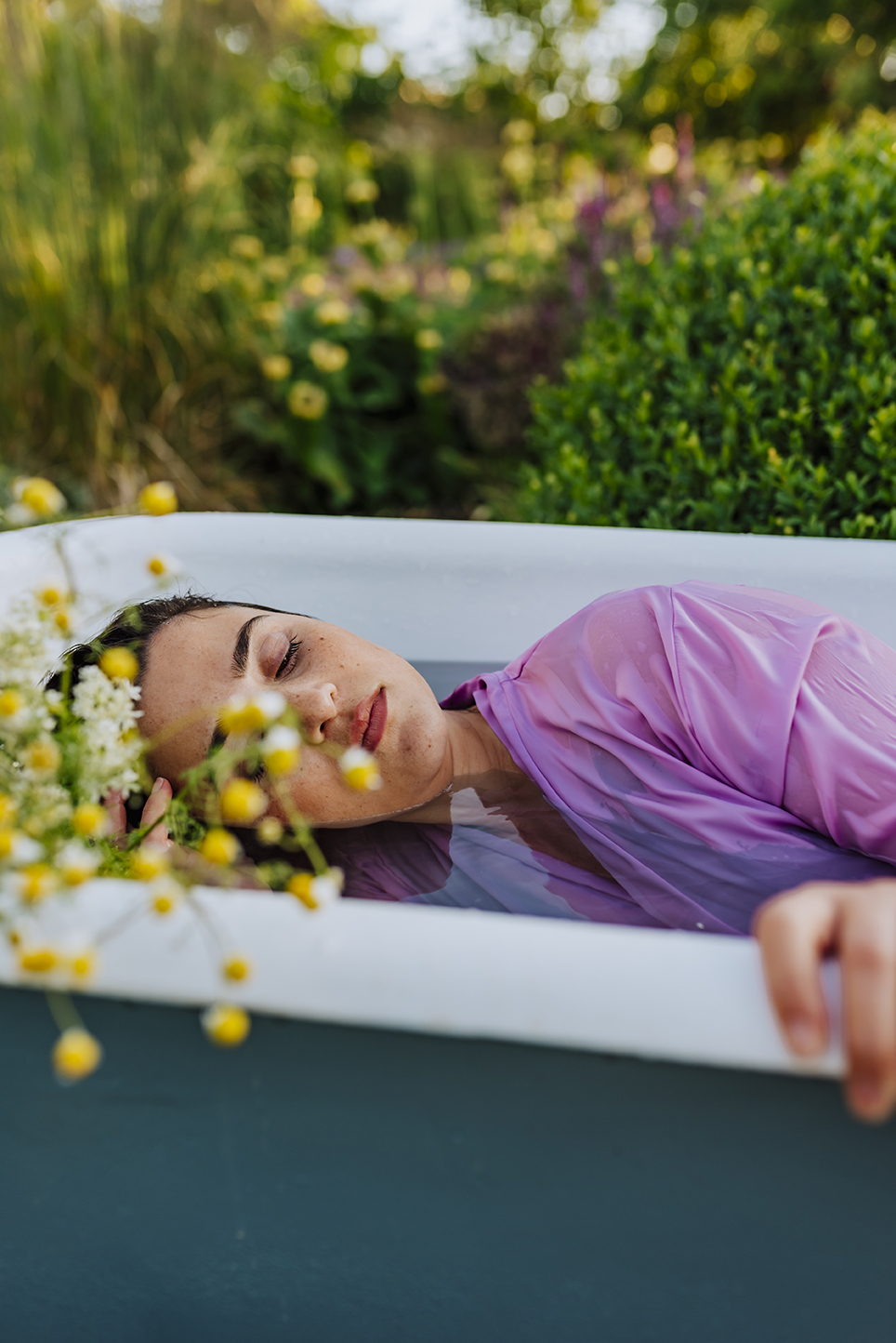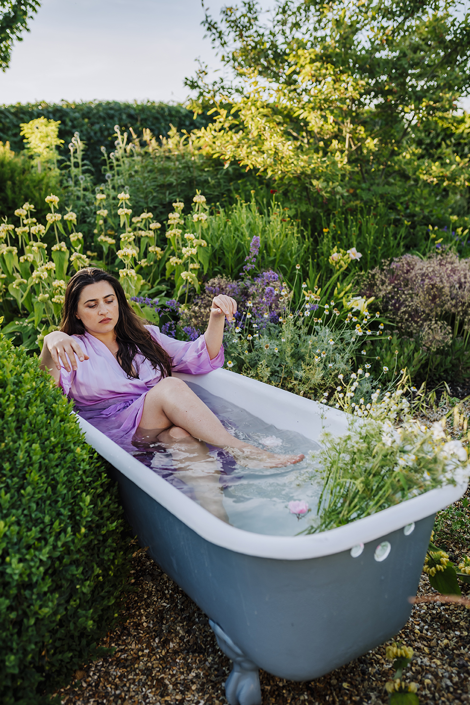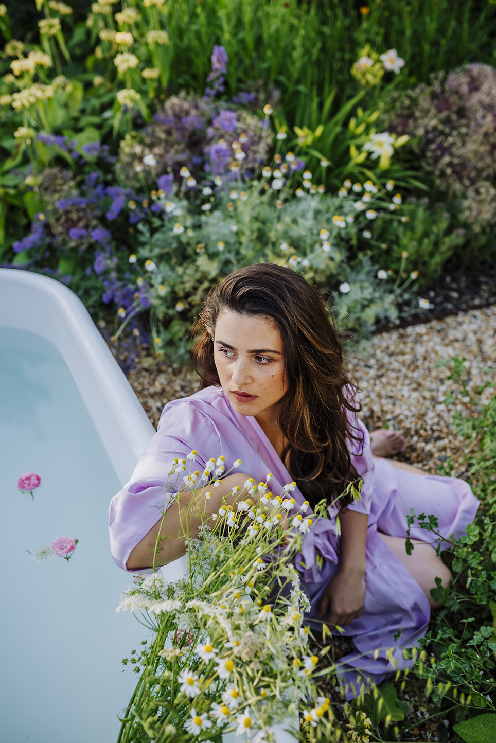 Eine alte Badewanne mit Löwenfüssen findet man nicht alle Tage in einem wunderschönen Blumengarten. Die steht nämlich normalerweise nicht dort. Eigens für das Fotoshooting mit Tina wurde diese Badewanne inmitten dieses kleinen Paradieses aufgestellt. Für ein Portraitshooting voller Sinnlichkeit, Blumen, weiblicher Stärke und ja, auch ein bisschen Romantik. Wie ein schöner Traum.